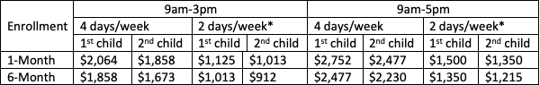 Enrollment is offered on a monthly basis. There is a 10% discount for 6 month enrollments (Jan.-June; July-Dec.), and a 10% discount for second child enrollments. These discounts are stackable. See table below: